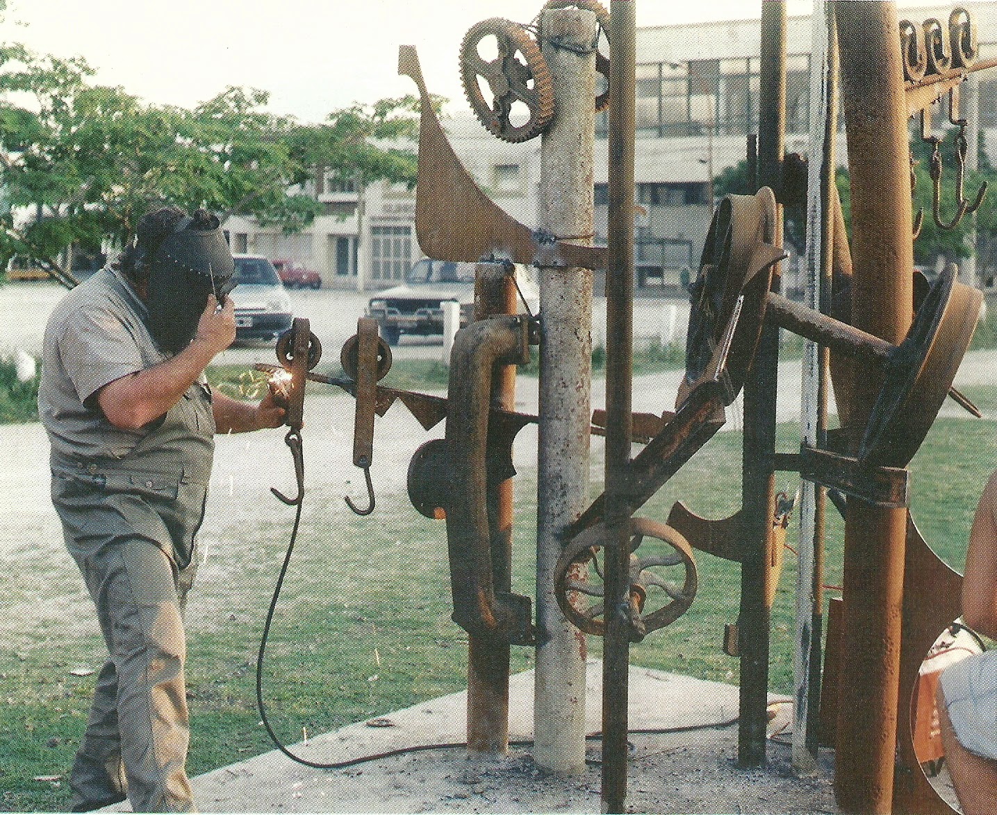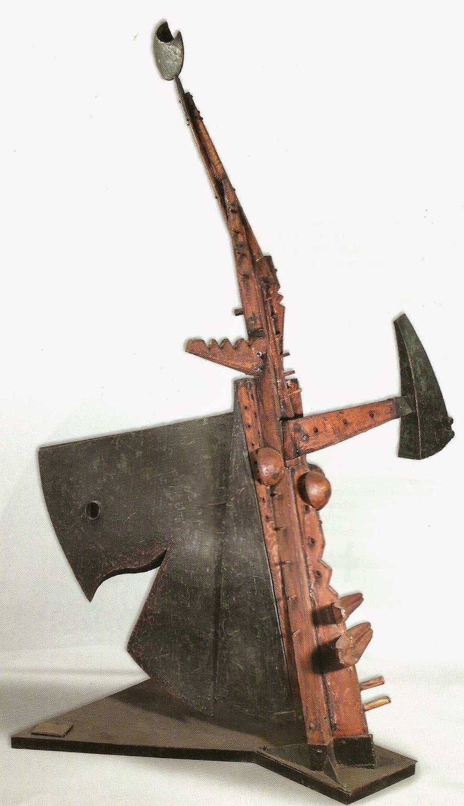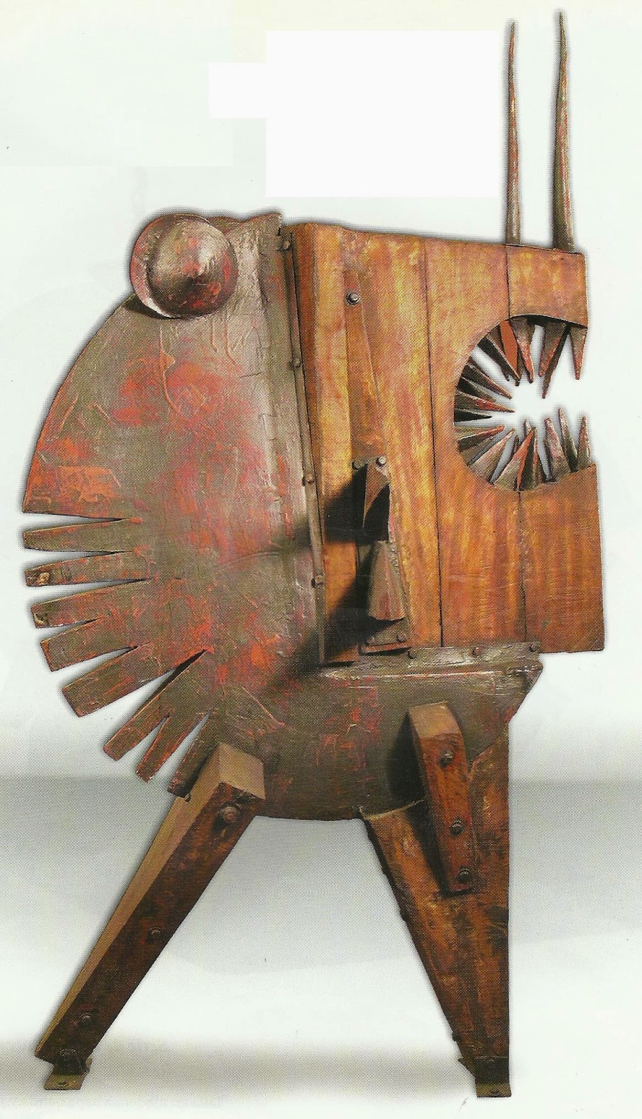 O.S.- Últimamente prefiero la madera y el hierro. Para mí la madera es femenina, te seduce, es como la mujer. Uno se cree que la maneja, que la puede dominar pero no es así, te termina dominando y manejando a vos. Es como el famoso sí mi amor, sí querida. Con la madera sucede lo mismo. A la madera la única forma de manejarla es seduciéndola. El hierro es un material que también permite cierta soltura y desenvolvimiento con otras respuestas. Lo que me entusiasma es trabajar la ensambladura, madera, hierro y un tercer elemento, el color; policromar la obra, darle otro tipo de dramatismo utilizando como recurso plástico el color. En cuanto a la imagen, estoy intentando una vuelta muy primaria de figuración. Estoy haciendo animales, monstruos. La obra es una excusa para decir cosas. Lo importante no es el material ni la forma, sino la idea. Yo estoy tratando de construir un mundo mejor desde mi lugar, desde mi posición desde mi trabajo sueño y pretendo un mundo mejor para mis hijos y para los contemporáneos de mis hijos. Nosotros somos personajes del siglo XX. Ellos van a construir el siglo XXI. Entonces quiero un país con mayor equidad, con igualdad de oportunidades, más solidario, donde todos los jóvenes argentinos tengan las mismas oportunidades. Desde mi lugar. En este momento estoy trabajando una serie de imágenes sobre la guerra. Me conmocionó mucho esto de la invasión imperialista a Irak. Más allá de la opinión que pudiera tener sobre Saddan que en este momento pasa a un segundo plano. La masacre de Afganistán, la masacre de Irak que continúa, el genocidio que está cometiendo el gobierno autoritario de Israel con el pueblo palestino y muchos otros espantos similares no difieren demasiado de lo que fue el espanto de Vietnam o lo que fue el genocidio nazi. La guerra en cualquiera de sus manifestaciones es terrible. André Bretón contaba que tenía un paciente que en sus alucinaciones decía que la guerra era una gran fantasía, que era un invento; que los soldados eran actores y los heridos y los muertos maniquíes. Y cuando terminaba la batalla los soldados volvían a sus casas a vivir con sus familias, retiraban los muñecos y el campo de batalla se llenaba de flores nuevamente. Sería maravilloso que pudiera ser así. Que la guerra no existiera y que las balas se convirtieran en flores.